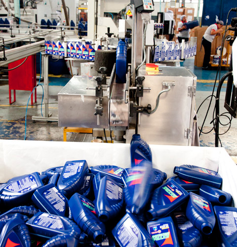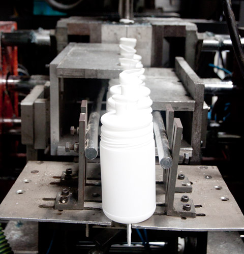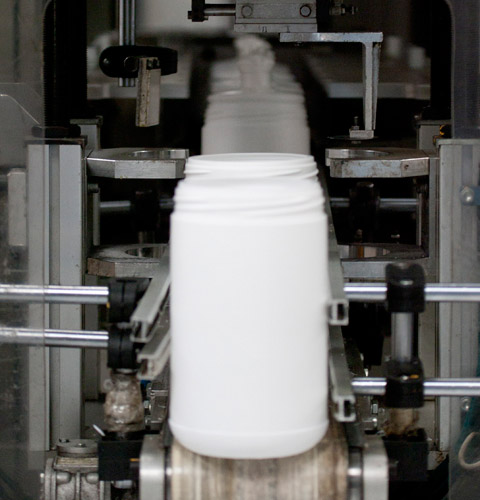 The containers are manufactured by blow molding high-tech machines. The process begins with the mixing and heating of the resin (HDPE) for forming a parison in a blow mold; then an air pressure inside the parison causes the material adhere the mold walls, allowing the formation of the container, once the cooling cycle has finished the mold is opened and the product is extracted.